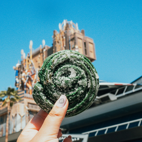 Since I hadn't eaten since about 6:30AM, my body was not doing so well, so I jumped at the option of being able to have some of the new snacks. Of course, I opted to have one of each treat: the Sweet Spiral Ration (a bright green pineapple-flavored churro) and the Cosmic Cream Orb (black cream puff filled with whipped raspberry cheesecake).